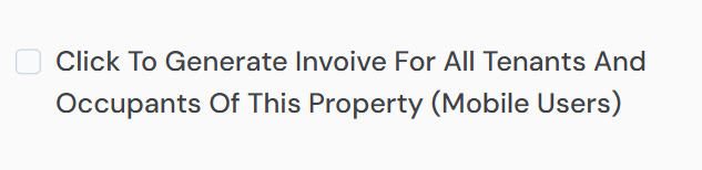 The “Generate Invoice” action will automatically create invoices for every unit within the selected property. It will issue a payable notification to all tenant or occupant accounts linked via the mobile app. This option is ideal for applying the same invoice type across all units – such as bulk billing, estate-wide fees, or general fee collection. Ensure all settings are accurate before proceeding, as this action will uniformly apply to every unit in the property.