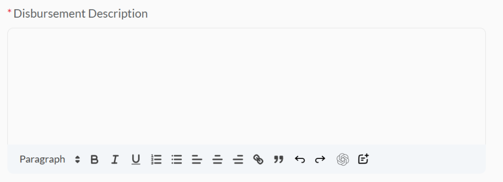 Use this dropdown to choose the method of disbursement used for the payment. Selecting the correct disbursement method ensures accurate financial records and helps in future audits or reconciliations.