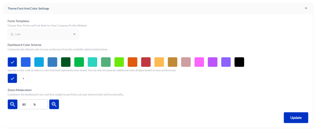 - Click Update to apply the new font across the dashboard.