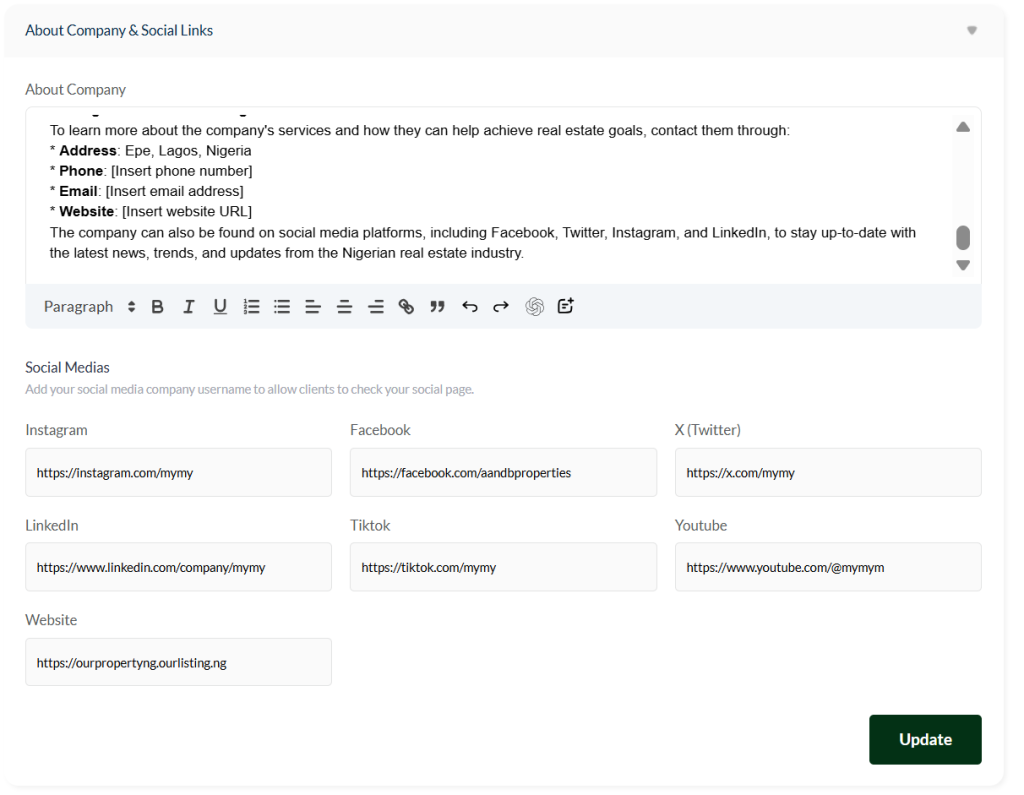 - After editing any section, click the “Update” button to apply the changes across your company dashboard and website.