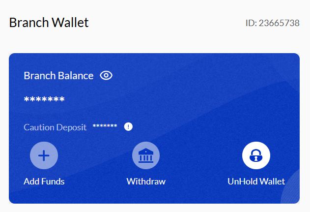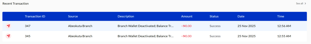 The Branch Wallet Card provides a real-time overview of the branch’s financial status, including its current wallet balance and recent transaction history.