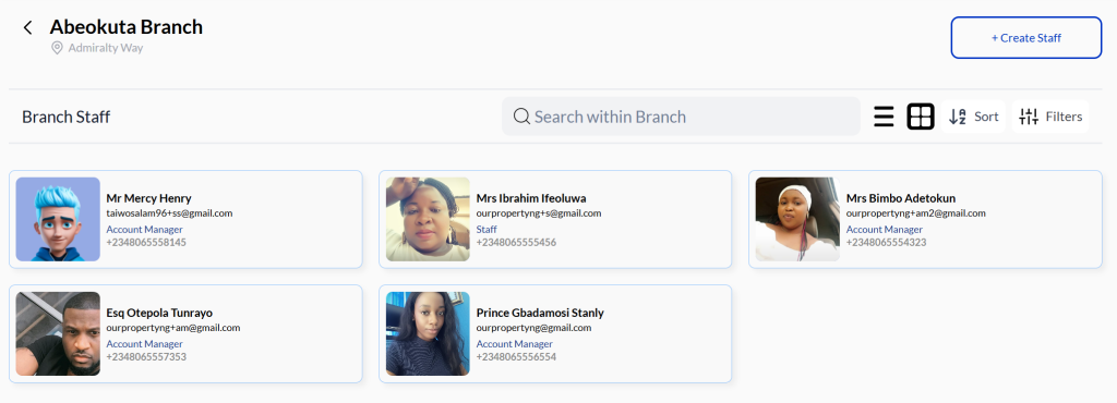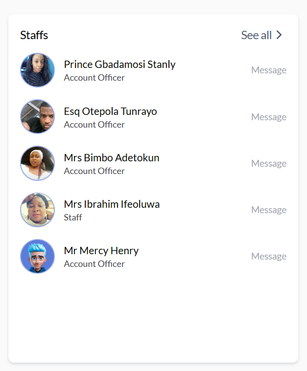 The Staff Summary Card provides a quick overview of all staff members assigned to this branch, allowing you to access their profiles or send messages with a single click.