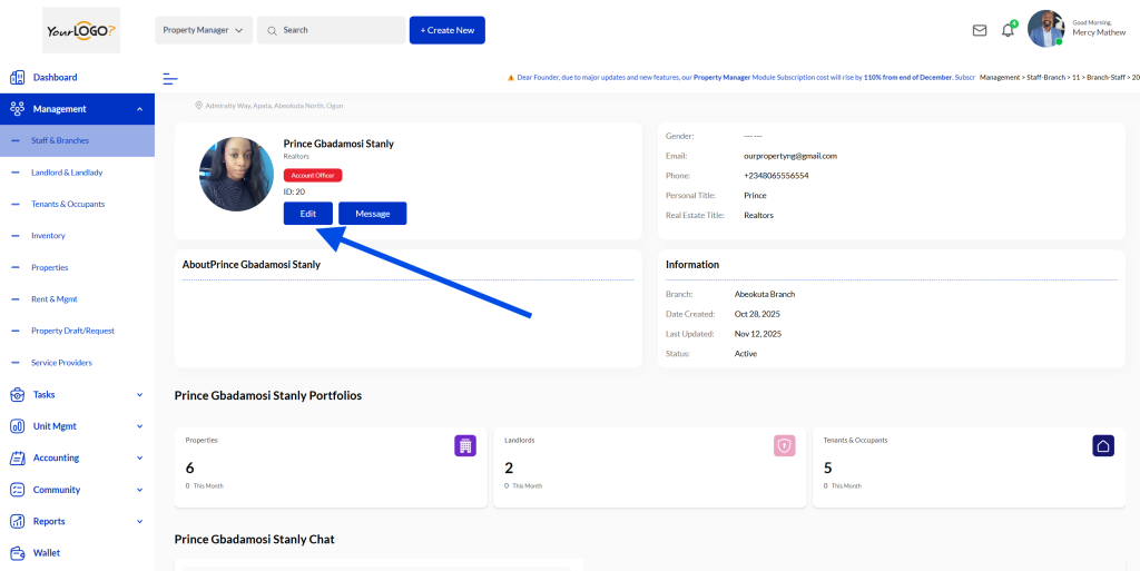 Name: Edit the staff member’s full name as it should appear in the system (e.g.,Mathew John). This name will be used in all internal and external records.