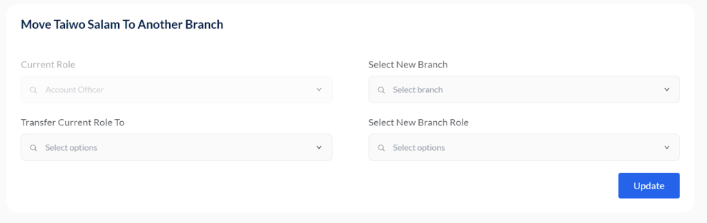 Choose the new branch to which they will be assigned. (Optional) Assign a successor: select a new staff member to take over their current role. Choose the new role for the transferred staff member in their destination branch.